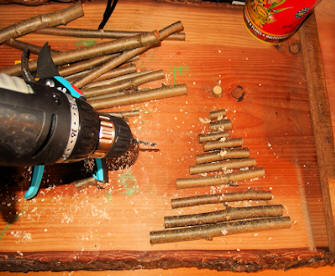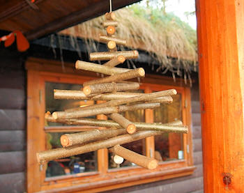 | Hvis man alligevel skal fjerne lange lige årsskud fra hassel eller rønnebuske, så kan man let lave et sødt juletræ til ophæng. Klip grenene ud i stadig kortere stykker, bor et lille hul gennem midten af hvert stykke. Sæt et lille stykke eller en perle på et stykke ståltråd og før så ståltråden gennem alle pindene. Anret dem så, så de stritter til alle sider. Voila. | |